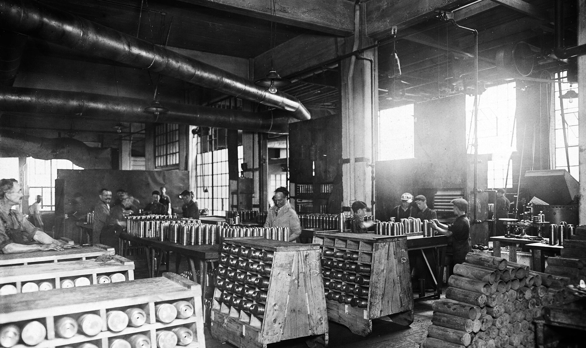 Après le déclenchement de la guerre, lord Kitchener, secrétaire d’État britannique à la Guerre, ordonne au département de la Milice canadienne d’acheter en son nom des équipements militaires aux États-Unis. Le ministre de la Milice et de la Défense, Sam Hughes, s’exécute, mais profitant de cette ouverture, il convainc lord Kitchener de passer d’autres commandes au Canada. Peu à peu, le secteur manufacturier canadien (fortement concentré en Ontario), où la production de munitions était quasi inexistante, se développe au point d’assurer un tiers de l’approvisionnement en munitions et de satisfaire la moitié des besoins en éclats d’obus utilisés par les forces britanniques. En particulier, le nombre d’obus exportés du Canada vers l’Europe passe de 3 000 en 1914 à près de 24 millions en 1917. Il s’agit d’une réalisation industrielle majeure en dépit des tristes circonstances.