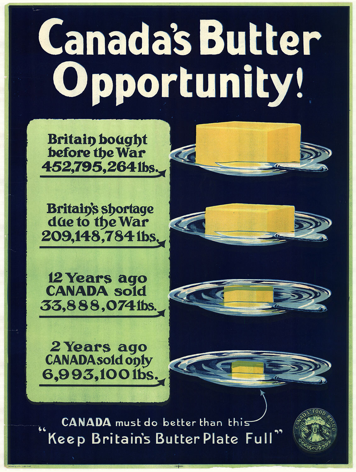 Affiche de guerre « Canada’s Butter Opportunity », créée par la Commission canadienne du ravitaillement pendant la Première Guerre mondiale; l’affiche incite les Canadiens à consommer moins de nourriture pour en expédier en plus grandes quantités à l’étranger.