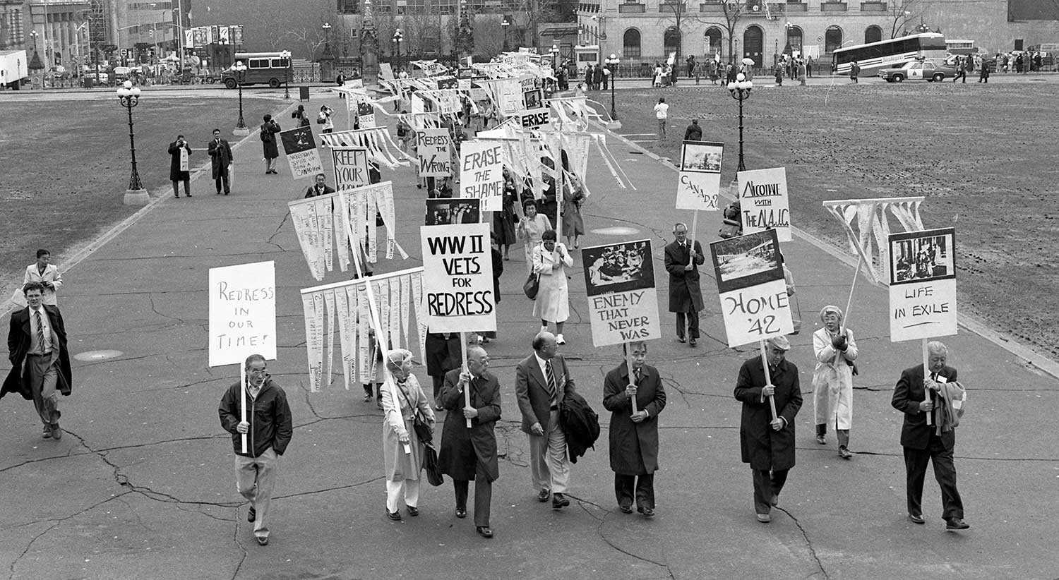 Photo : Les associations culturelles nippo-canadiennes de tout le Canada, telles que le Nikkei Network of Niagara, dont on aperçoit les membres sur cette photographie, protestent contre les injustices commises à l’encontre de leur communauté pendant et après la guerre. En 1988, le gouvernement fédéral présentera des excuses officielles aux Canadiens d’origine japonaise et leur proposera une compensation financière. 2010.32.124 (Photo : Nikkei National Museum)