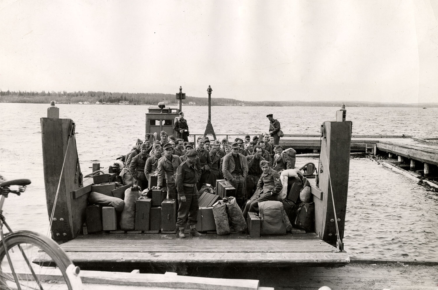 Photo : Tirée d’un article du Toronto Star, cette photographie montre des prisonniers allemands ayant quitté le Nord de l’Ontario la même semaine après avoir terminé leur besogne de coupage de bois à pâte dans la région de Longlac. Sur la photo, une embarcation de débarquement les amène à la ligne de chemin de fer. La destination des hommes n’a pas été révélée, mais il est possible que certains d’entre eux aient été envoyés dans l’Ouest de l’Ontario pour aider à la récolte de betterave sucrière et de tabac. (Photo : Toronto Reference Library)