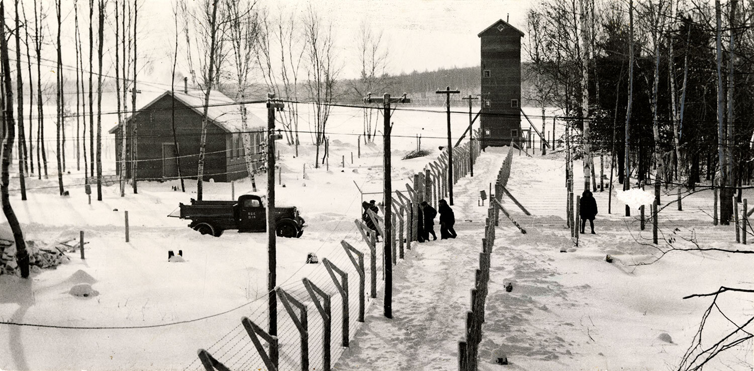 Photo : Cette photographie a été initialement publiée dans un article du Toronto Star contenant la phrase suivante : « Les prisonniers mènent leur vie, des chants allemands provenant du camp d’internement de Petawawa résonnent dans la nuit ». Les prisonniers étaient payés 20 cents par jour pour défricher les forêts et couper du bois. (Photo : Toronto Reference Library)