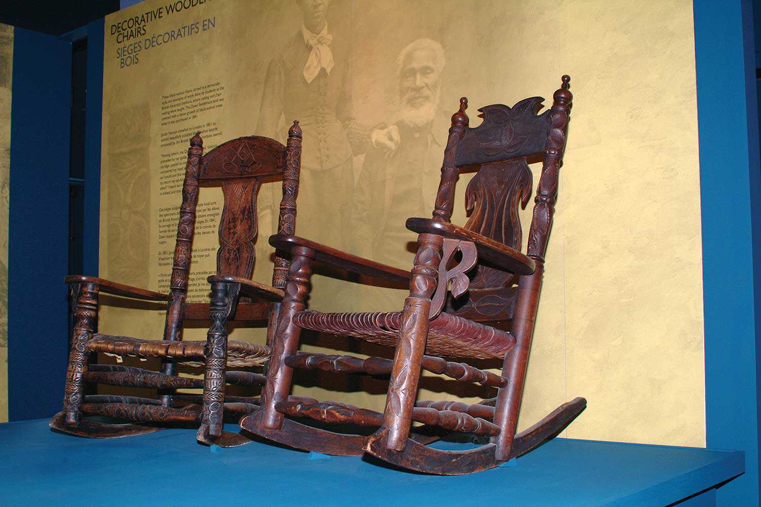 Ces superbes chaises décoratives en bois sont des exemples frappants du travail réalisé par les élèves du British American Institute. Ces artéfacts sont des exemples exceptionnels d’un savoir-faire de style vernaculaire issu de la région de Dresden. Les symboles que l’on trouve sur ces chaises permettent d’imaginer la vie que menaient les personnes qui les ont créées et utilisées. Elles sont exposées en permanence au site historique de la Case de l’oncle Tom.