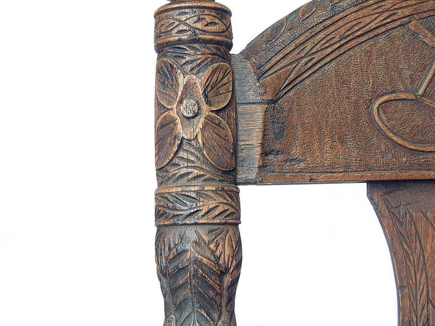 Chacune de ces chaises est unique et révèle le talent de l’artisan qui l’a réalisée. Les chaises étaient faites à la main en bois de noyer (lequel poussait peut-être sur le site). L’utilisation d’un tour à bois permettait de le modeler et ainsi de créer des pieds et des moulures décoratives. Ces pièces étaient ensuite assemblées en utilisant des techniques européennes traditionnelles de fabrication de chaises. La décoration de ces chaises est saisissante. Les pieds et le dossier comportent des détails élaborés, souvent exubérants, sculptés à la main.