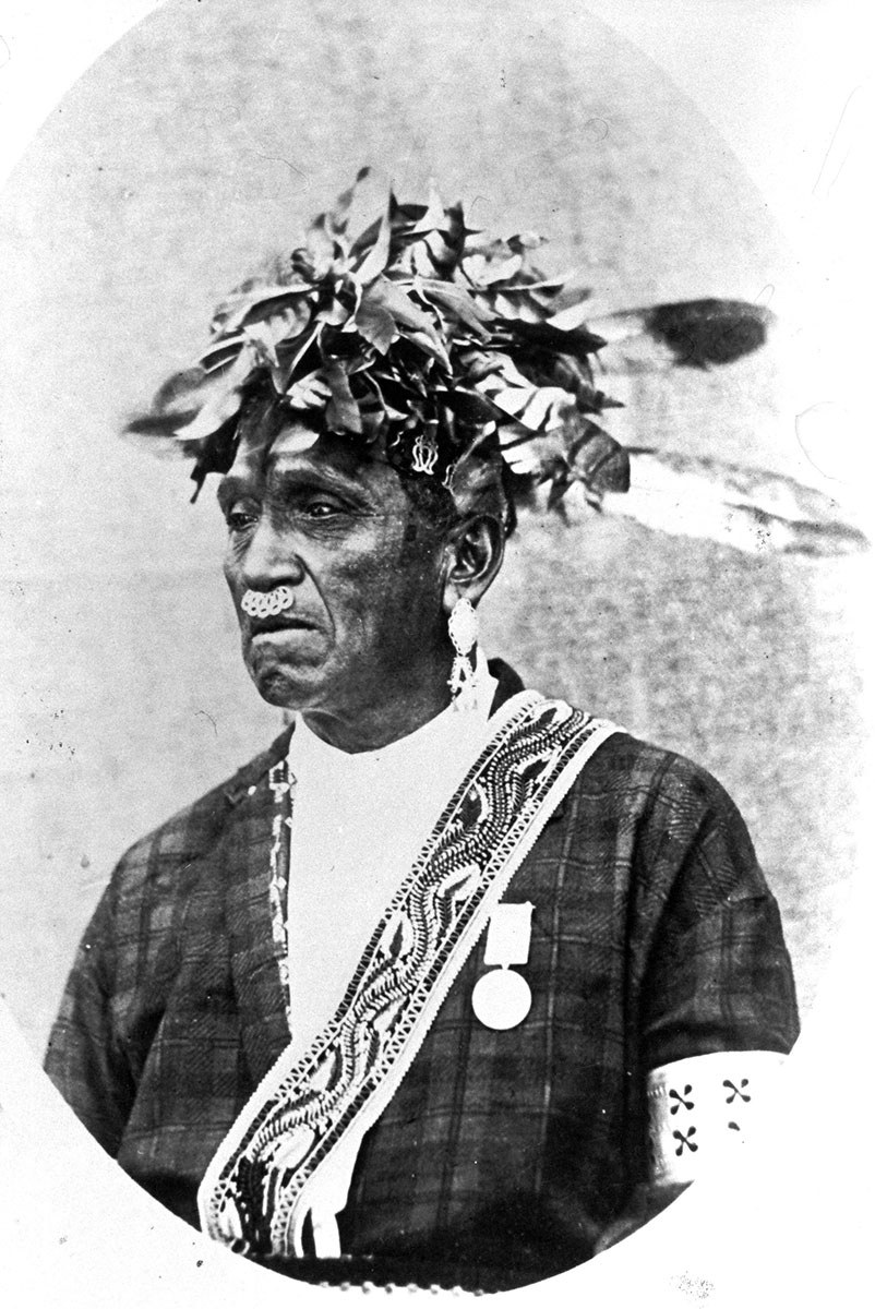 Photo : Coiffure « gustoweh » sénéca des années 1870, portée par Solomon O’Bail.