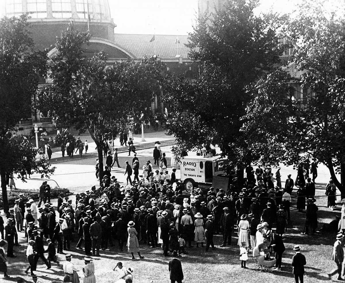 Dans les années 1920 et 1930, les innovations technologiques en matière de musique, de radio et de télévision ont renforcé encore un peu plus les liens à l’échelle du Canada. En 1920, la Compagnie Marconi installe un émetteur radio dans le pavillon du chemin de fer (aujourd’hui le pavillon de la musique), fait jouer de la musique sur un phonographe et la diffuse par le biais d’un appareil récepteur situé dans le bâtiment d’horticulture, environ 100 mètres (320 pieds) plus loin. La musique ne se cantonnait plus à une seule pièce. En 1922, le Toronto Daily Star (aujourd’hui le Toronto Star) va encore plus loin : afin de démontrer le potentiel de la radio sans fil, le quotidien fait circuler un véhicule de diffusion radiophonique aux quatre coins de la foire pour donner des nouvelles du monde à des milliers de personnes.