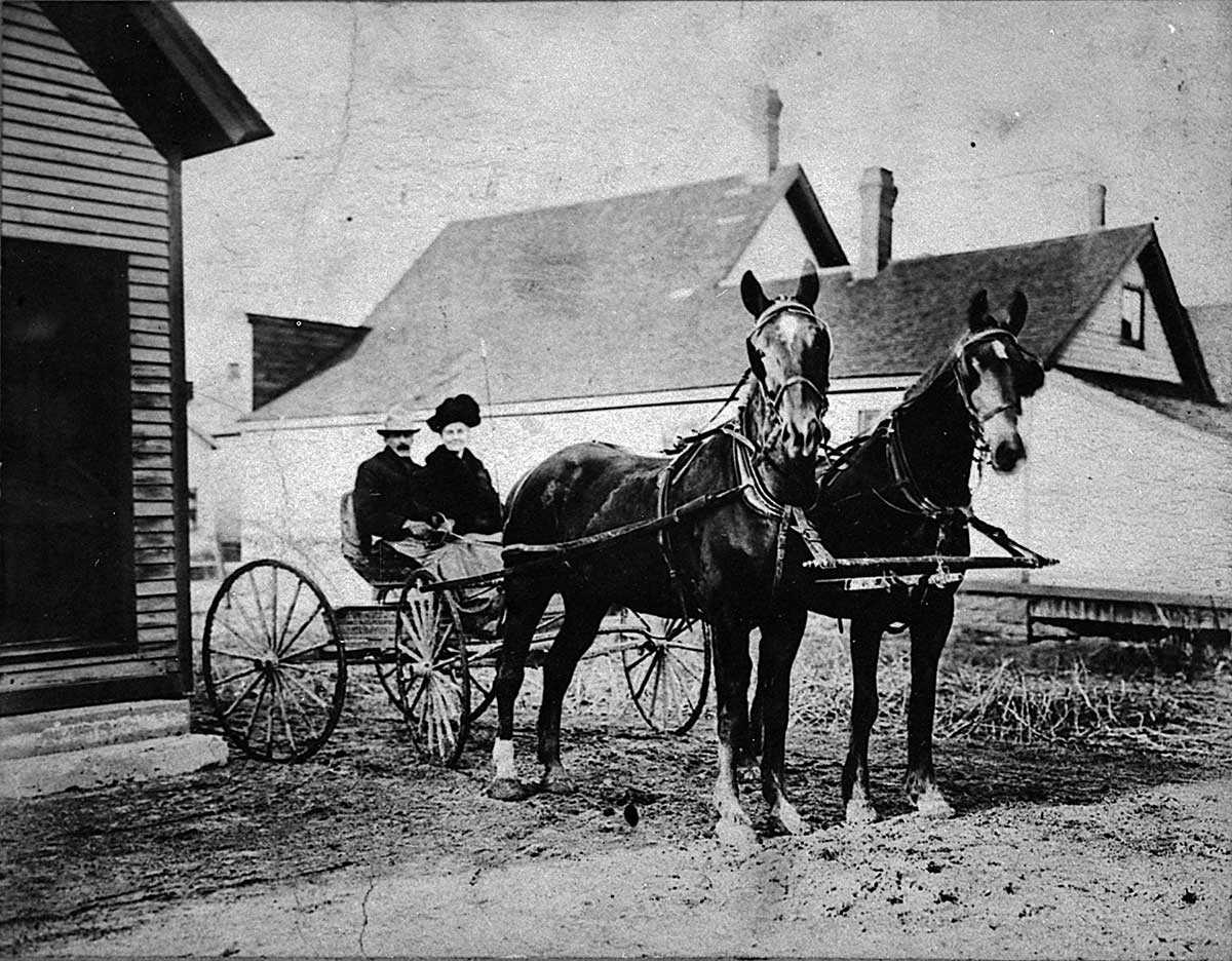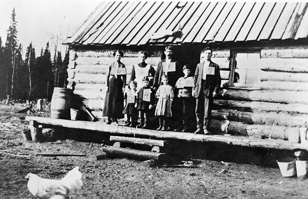Photo : Scène typique des premiers stades de la vie d’une famille de colons dans le Nord de l’Ontario, Val Gagné (Ontario), vers 1912. Joseph Aumont, fermier originaire de la région de Joliette, son épouse et leurs trois aînés, Gabrielle, Albert et Rita; Léa et Edouard Aumont de la famille Ludger Aumont; François, fils de Simon Aumont. Université d’Ottawa, CRCCF, Fonds TVOntario (C21), Reproduit de la collection de Germaine Robert, Val Gagné (Ontario).