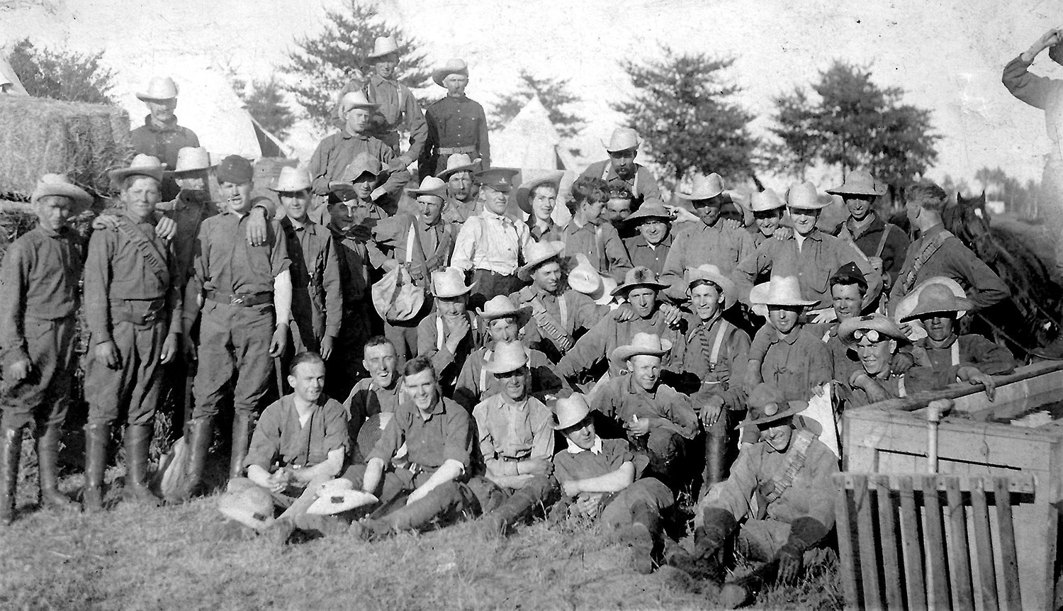 Dans toute la province, des unités de la milice canadienne interviennent dans l’entraînement annuel habituel. Dans les manèges militaires des villes (dont beaucoup sont tout neufs – fruit de la campagne de construction du gouvernement fédéral à l’époque édouardienne), des soldats à temps partiel prennent part à des exercices d’entraînement, s’exercent à la mousqueterie et se forment à l’hygiène de campagne et au génie militaire. Ces unités portent des noms imposants – Queen’s Own Rifles, Governor-General’s Foot Guards, Prince of Wales’ Own Regiment – et les hommes ont belle allure. Fortunés et influents, leurs officiers disposent des ressources nécessaires pour veiller à ce que les soldats s’acquittent toujours bien de leurs fonctions. Certains commandants vont même jusqu’à emmener leurs unités en Grande-Bretagne pour leur faire effectuer des manœuvres estivales destinées à améliorer leurs performances et pour les exhiber.
