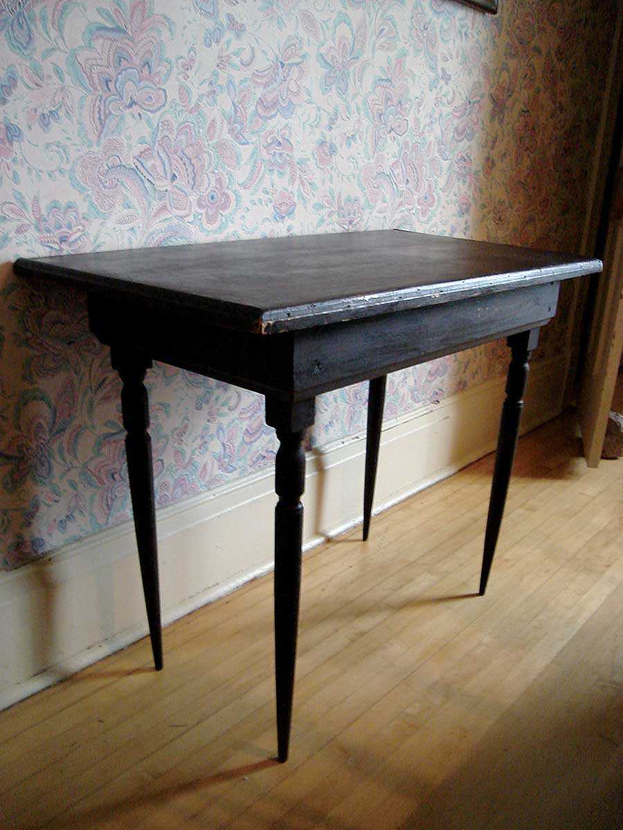La collection Walls est un mélange éclectique de mobilier domestique des 19e et 20e siècles, dont on pense qu’une grande partie date de l’époque où la famille Walls vivait dans la maison. Une simple et élégante table en pin peinte, faite à la main par John Walls, est un meuble particulièrement intéressant. D’après certains écrits, on l’appelait la « table de la paye ». Mme Jean Roy, la fi lle aînée de John Walls, a raconté que son père rapportait à la maison les payes de la scierie dans un seau, qu’il déposait sur la « table de la paye », devant les fenêtres d’angle, dans une chambre à l’étage. Elle avait alors la responsabilité de sceller toutes les enveloppes contenant les payes, et recevait 10 cents pour ce travail.