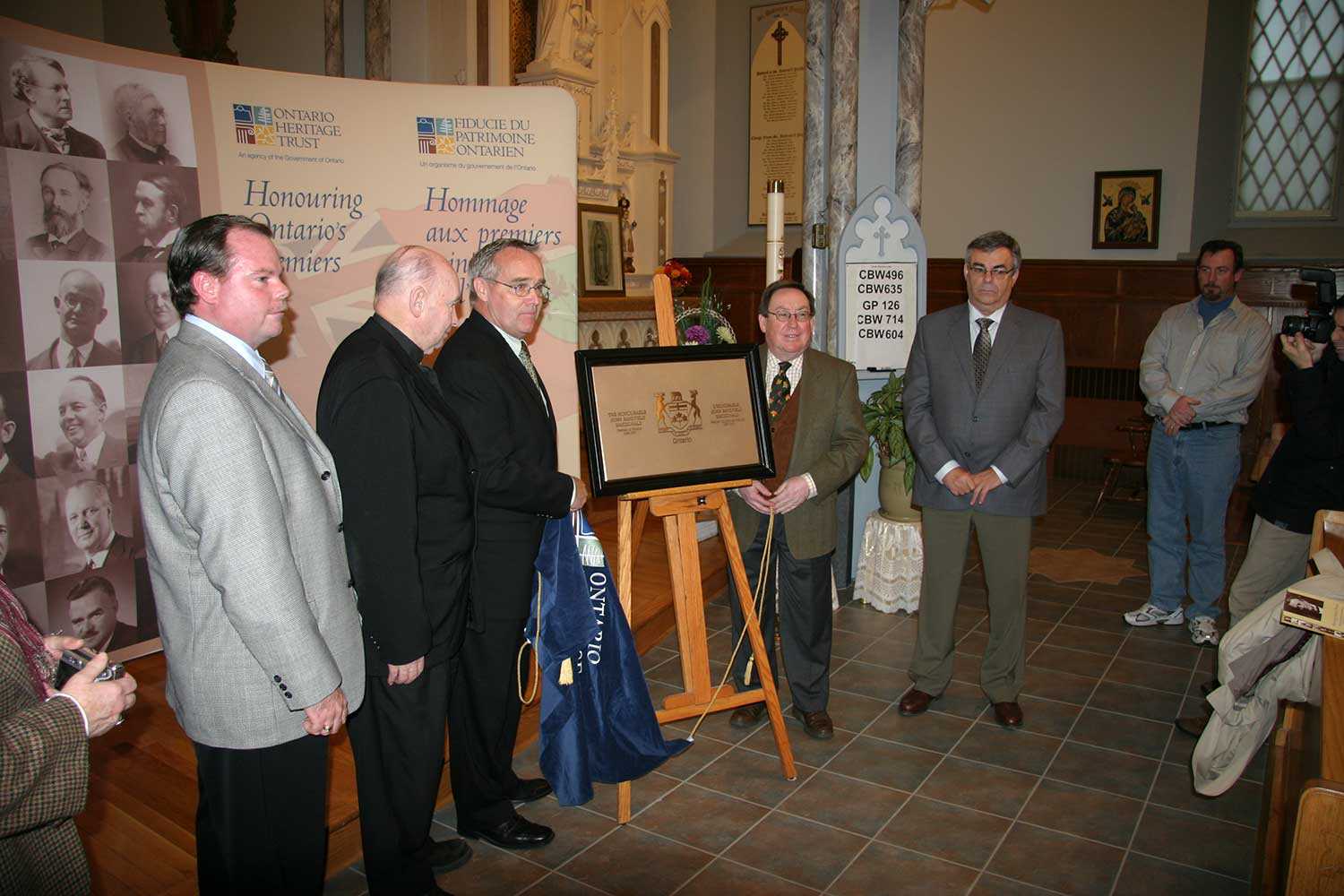 La cérémonie de dévoilement de la plaque s’est déroulée à l’église catholique St. Andrews à St. Andrews West. Celle-ci a été suivie du lever des couleurs, auquel les participants ont été invités à assister au St. Andrews Roman Catholic Pioneer Cemetery (cimetière catholique des pionniers de St. Andrews) tout proche, dernière demeure de Macdonald. La Fiducie s’est employée, en collaboration avec la collectivité locale et la commission en charge de la gestion du cimetière, à assurer le succès de cet événement chargé de sens. Les descendants de John Sandfield Macdonald avaient également été consultés, certains d’entre eux étant présents pour rendre hommage à un ancêtre qui a joué un rôle important dans l’histoire de l’Ontario.