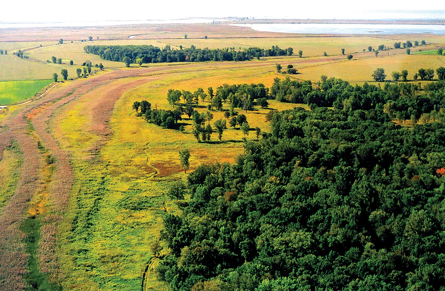 Photo : Le patrimoine immatériel peut éclairer notre approche à l’égard de l’environnement. La Première Nation de Walpole Island prend soin du territoire bkejwanong depuis des générations selon une approche écologique traditionnelle et durable pour la protection de la terre et de l’eau. Vue aérienne du territoire de la Première Nation de Walpole Island montrant les prairies des Pottawatomis en 2004.