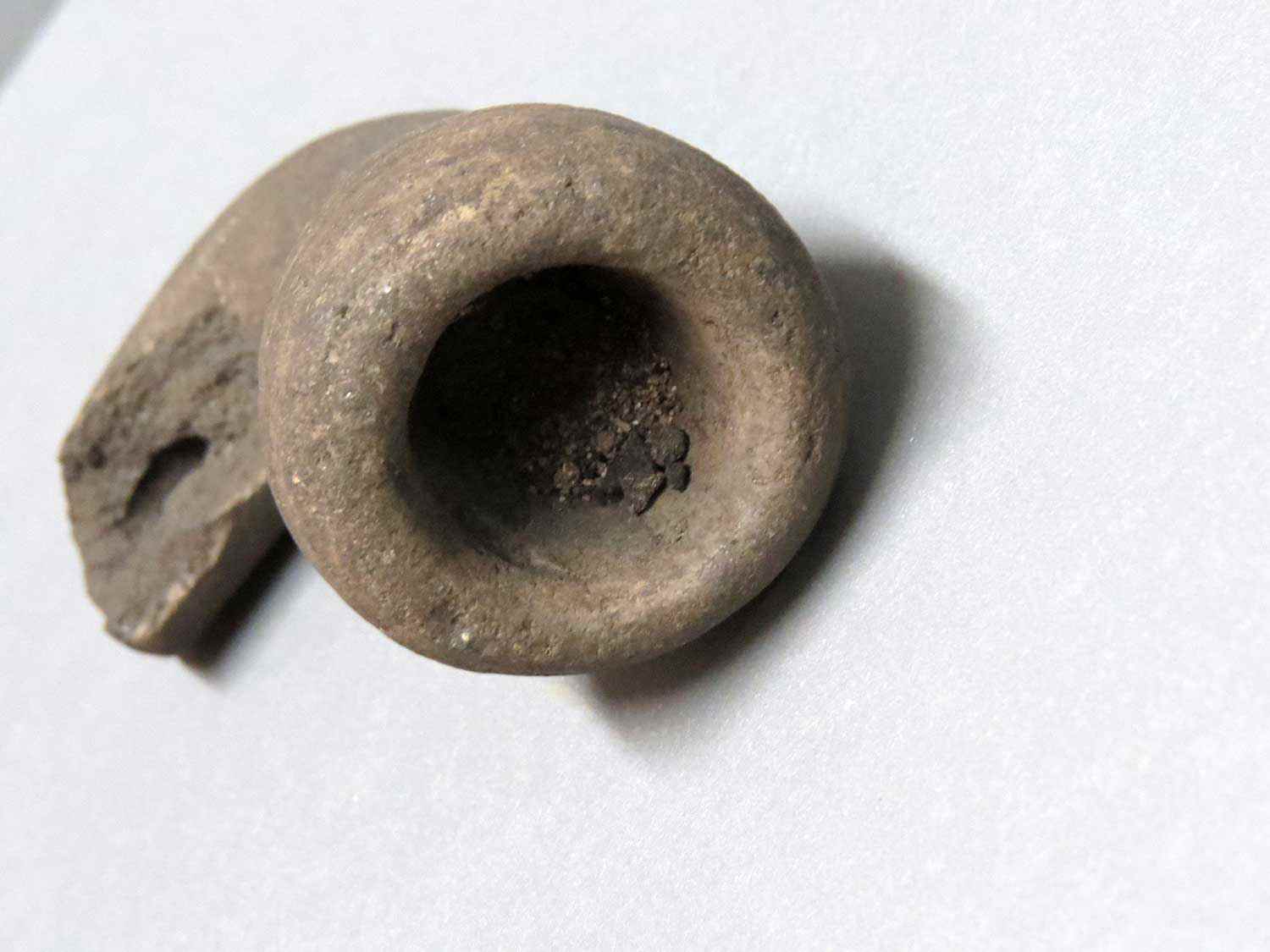 Les six lignes ont probablement été marquées à l’aide d’un foret en os, par exemple, juste avant que l’argile devienne trop dure. La pipe ne semble pas polie à la pierre, mais simplement lissée avec les doigts. L’ébréchure au niveau du conduit a pu se produire lors de l’insertion d’une tige de roseau dans la pipe allumée. J’ai vécu la même mésaventure par le passé avec une pipe en argile et j’ai pu observer des dommages similaires.