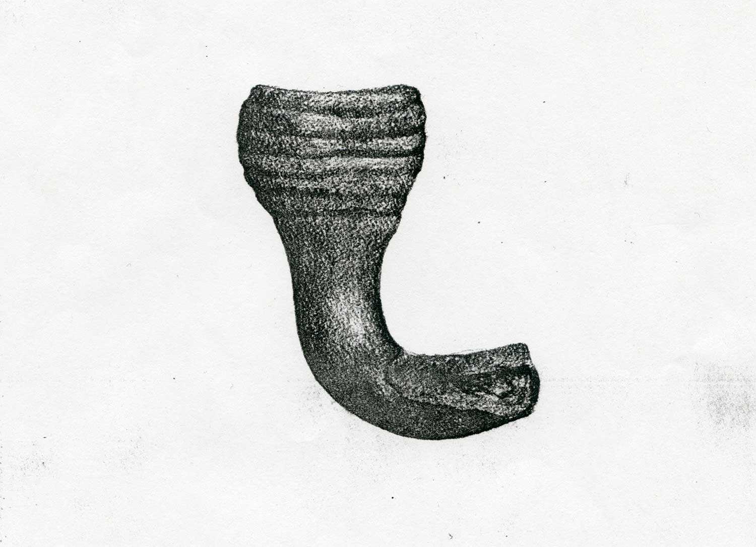 La pipe que nous avons découverte est en argile de la région. Elle a été façonnée à la main et cuite jusqu’à obtention de la dureté d’une brique. Objet typique des villages hurons du XVIIe siècle, elle se compose d’une tête ronde ornée d’anneaux tracés dans l’argile. Comme toutes les pipes et tous les pots en argile du peuple huron, elle n’est pas peinte. Le tuyau de la pipe a été formé en appliquant de l’argile humide autour d’un roseau ou d’un rameau, qui s’est consumé pendant la cuisson pour laisser place à un conduit uniforme. Son propriétaire aurait pu fabriquer un tuyau de remplacement en un ou deux jours.