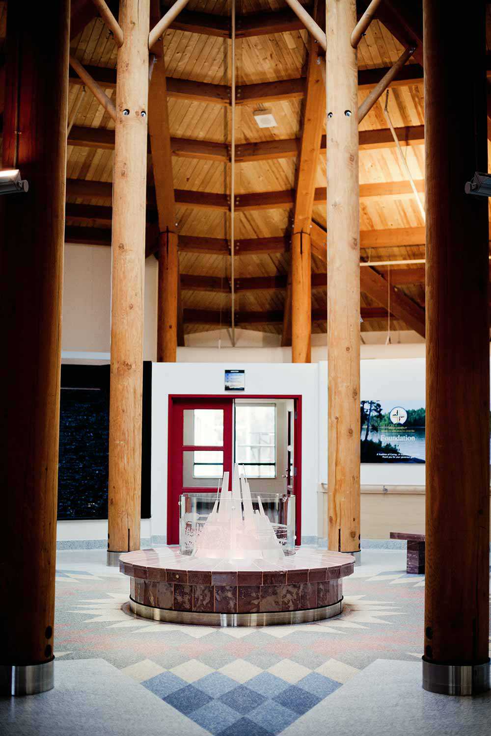 Photo : L’espace de rassemblement du Centre de santé Meno Ya Win de Sioux Lookout est supposé représenter une clairière, un hôtel pavillonnaire ou une longue maison avec un foyer symbolisant l’unité avec la communauté. Photo publiée avec l’aimable autorisation du Centre de santé Meno Ya Win de Sioux Lookout.