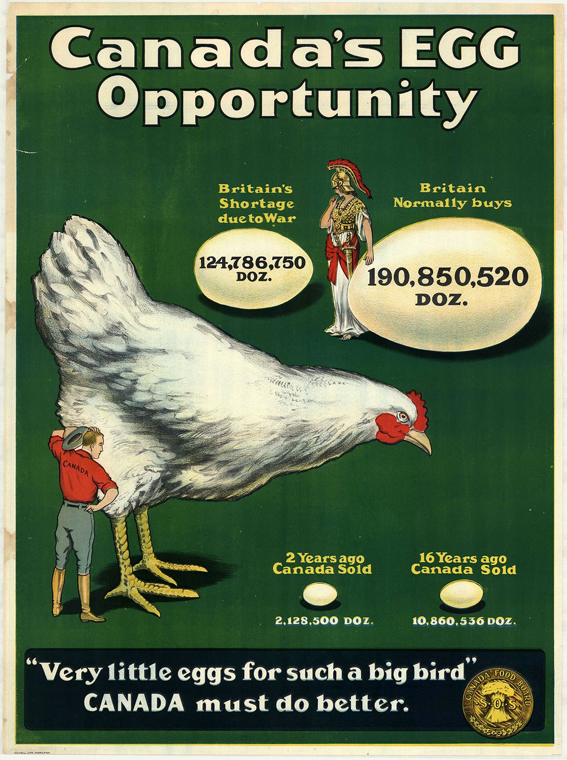 Durant les premières années de guerre, la production d’affiches est décentralisée et ad hoc. Les comités de recrutement locaux, les régiments ou d’autres organismes se procurent des affiches à titre individuel auprès d’imprimeries situées à Toronto, Hamilton et dans d’autres localités, qui emploient des graphistes (certains, comme J.E. Sampson, feront de brillantes carrières durant les années d’après-guerre). Les affiches canadiennes présentent parfois des similitudes avec d’autres modèles populaires conçus en Grande-Bretagne et dans les autres pays alliés.