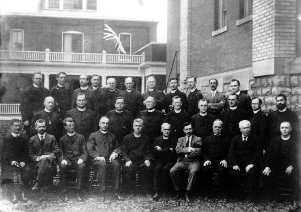 Photo : Réunion de prêtres canadiens français locaux au presbytère de la paroisse Our Lady of the Lake, qui sera plus tard le théâtre d’une émeute. Au milieu de la rangée inférieure, parmi les prêtres, se trouve Henri Bourassa, le célèbre leader nationaliste canadien français de Montréal. (Source : Centre de recherche en civilisation canadienne-française, Université d’Ottawa)