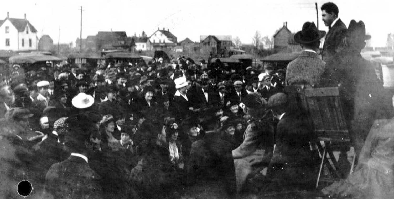 Photo : Le sénateur Gustave Lacasse s’adresse à un groupe de Canadiens français à Tecumseh, en Ontario, dans la banlieue de Windsor de Ford City, en octobre 1918, pour protester contre la nomination de François Xavier Laurendeau comme nouveau pasteur de la paroisse Our Lady of the Lake. Le père Laurendeau est soupçonné d’être un opposant aux écoles bilingues. (Source : Centre de recherche en civilisation canadienne-française, Université d’Ottawa)