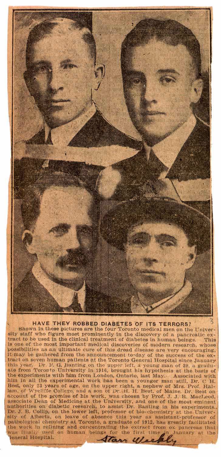 Photo : Coupure du quotidien The Toronto Star datant du 26 mars 1922, montrant (dans le sens horaire, à partir du coin supérieur gauche) Frederick Banting, Charles H. Best, James B. Collip et J.J.R. Macleod. Ce collage a été réimprimé dans plusieurs journaux canadiens. Reproduite avec l’aimable autorisation de la Thomas Fisher Rare Book Library, Université de Toronto. Collection Banting. C10025.