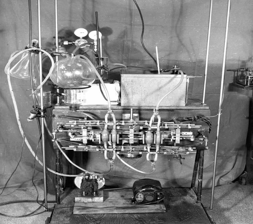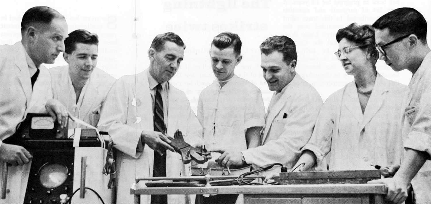Photo : Le Dr W.G. Bigelow et ses collègues participant à l’étude sur l’état d’hibernation sont groupés autour d’un électrocardiographe et d’un bain réfrigérant. Archives de l’Université de Toronto (printemps 1961), p. 56-57. Photo : Archives de l’Université de Toronto, Robert Lansdale Photography Ltd.