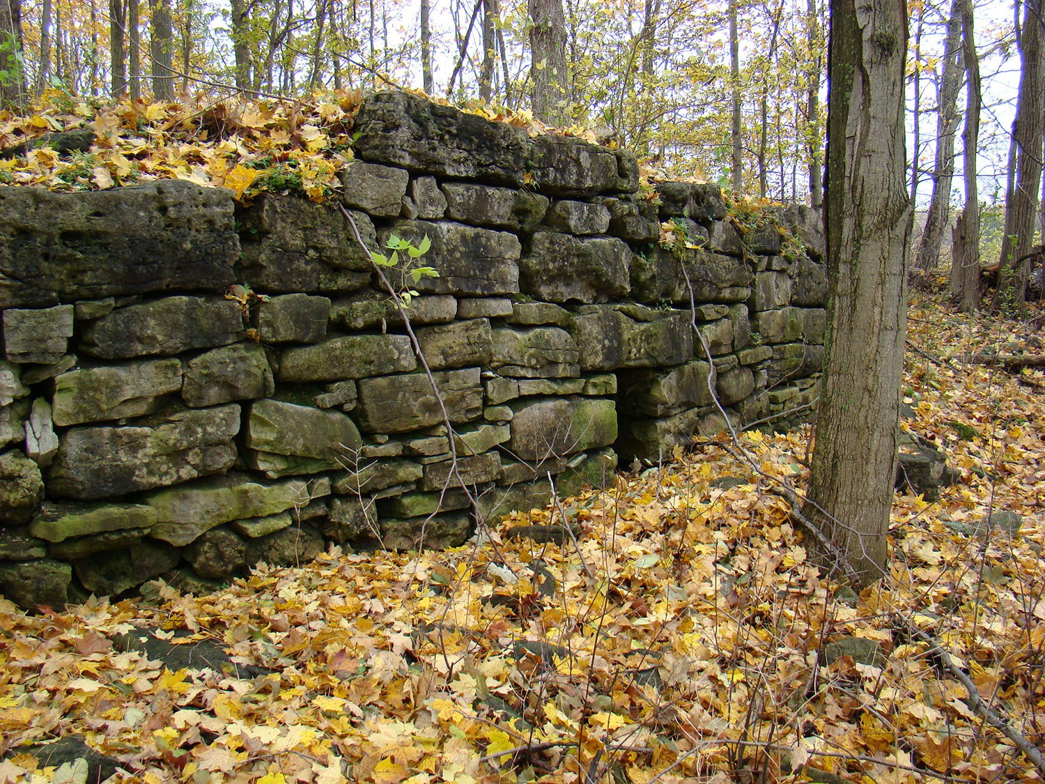Photo : Maçonnerie en ruines d’un four à chaux du XIXe siècle du côté sud de la ferme Scotsdale