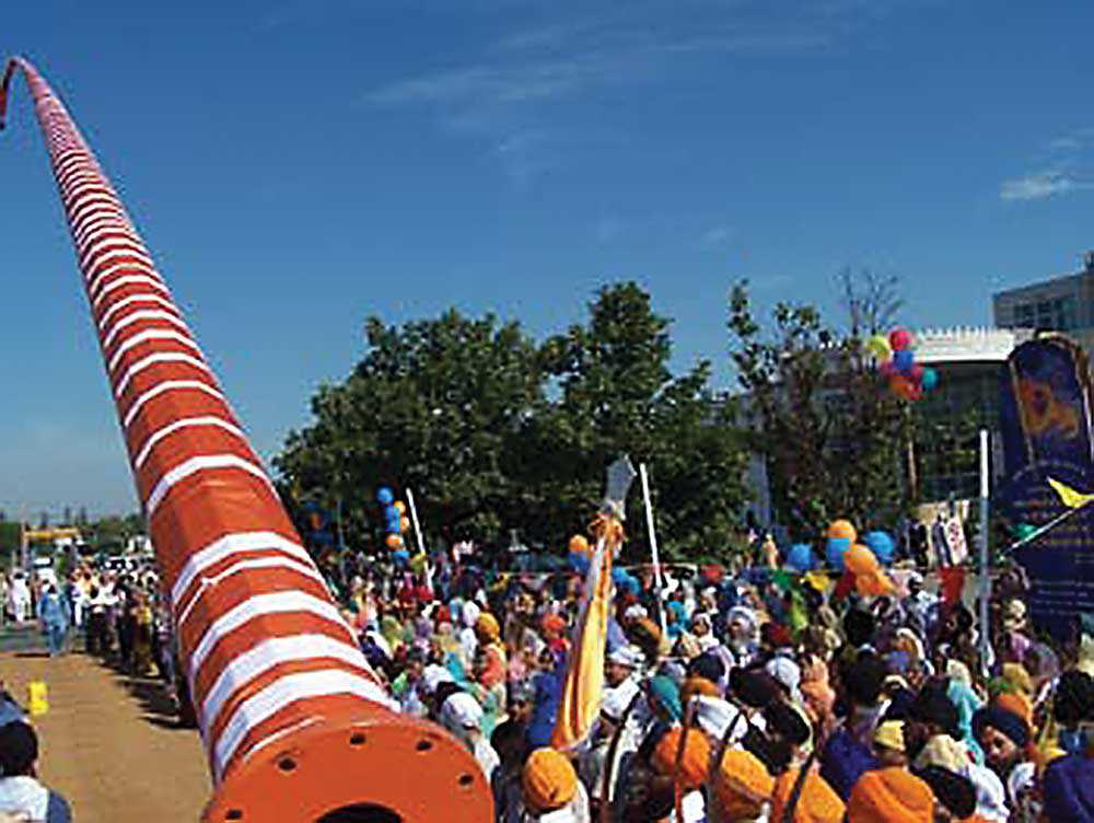 Photo : Le Nihsan Sahib, un drapeau Sikh sacré, flotte au-dessus de l’Ontario Khalsa Darbar (Photographie d'Ian Muttoo)