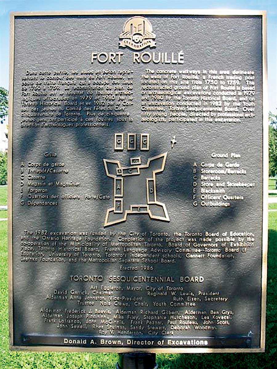 Photo : Plaque historique de Fort Rouillé, à Toronto. Le fort Rouillé, poste commercial et militaire, formait avec le fort Frontenac, le fort Niagara et d’autres la ligne de défense française contre les Treize Colonies et l’Angleterre. Bâti en 1750-1751, il fut détruit par sa garnison en 1759, pendant la guerre de la Conquête. (Photo : Alan L. Brown)