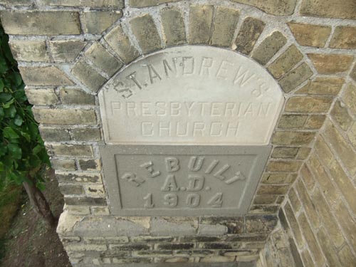 78, rue Woodstock Nord (auparavant St. Andrew's Presbyterian Church), pierre de date -