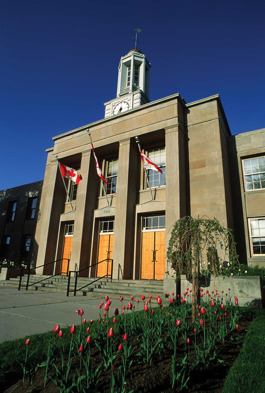 From the Hunter Street Bridge, the convergence of new and old in Peterborough can be most clearly seen. To the west is the bustling downtown that retains its historical character with its rows of late-19th-century commercial blocks, including the impressive Second Empire-inspired Morrow Building, built as a post office around 1878. Nearby is the city hall, flanked by several Romanesque Revival buildings, such as the Armouries, former YMCA and Peterborough Collegiate and Vocational School. At the centre of the adjacent Confederation Square is the war memorial, with bronze sculptures by Walter Seymour Allward, known for his design of Canada’s Vimy Memorial in France. Farther down George Street in the heart of the historic downtown is Market Hall, another impressive example of the city’s built heritage. Saved from demolition in the 1970s, it is now in the final stages of a multimillion dollar renovation that has restored its exterior façades, roof and distinctive clock tower.
