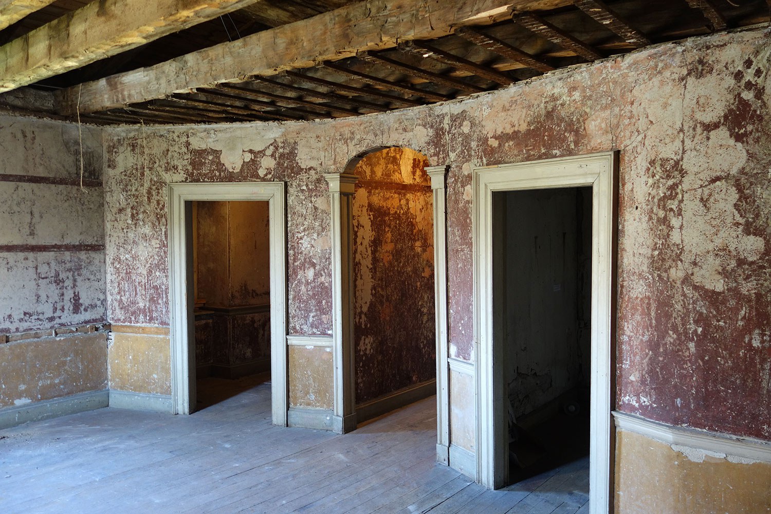 Calcimine is a water-soluble paint that was favoured for plaster mouldings because it could be easily washed off prior to recoating in order to avoid loss of sharpness due to paint build-up. Its survival into the 21st century is unexpected and rare. Elsewhere, walls have been over-coated with successive colours, now faded or partially chipped away, creating a rich colour matrix of depth and texture. In the basement, only remnants of the original lath and plaster ceiling remain, tucked between hewn timber beams accentuated with decorative beaded edges. In contrast, the plaster cornice of the ground-floor dining room is completely intact, requiring only minor repair to maintain its original integrity.