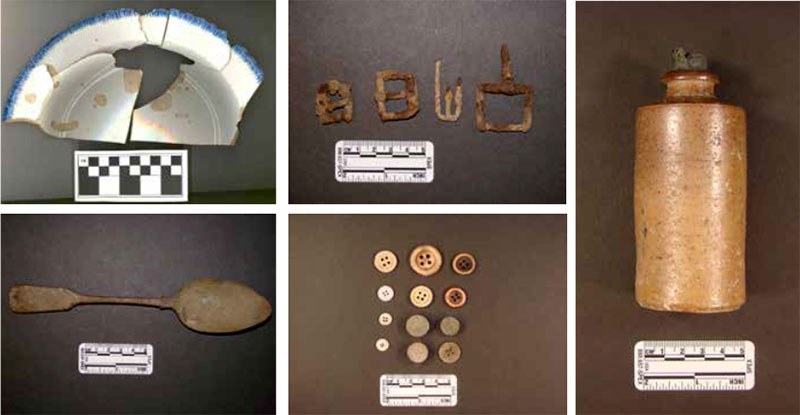 Photo: Over 135,000 artifacts were excavated during multiple field seasons at the MacDonell-Williamson site. Clockwise from top left: a blue edged platter, horse harness buckles, a stoneware bottle with cork intact, various buttons and a spoon.