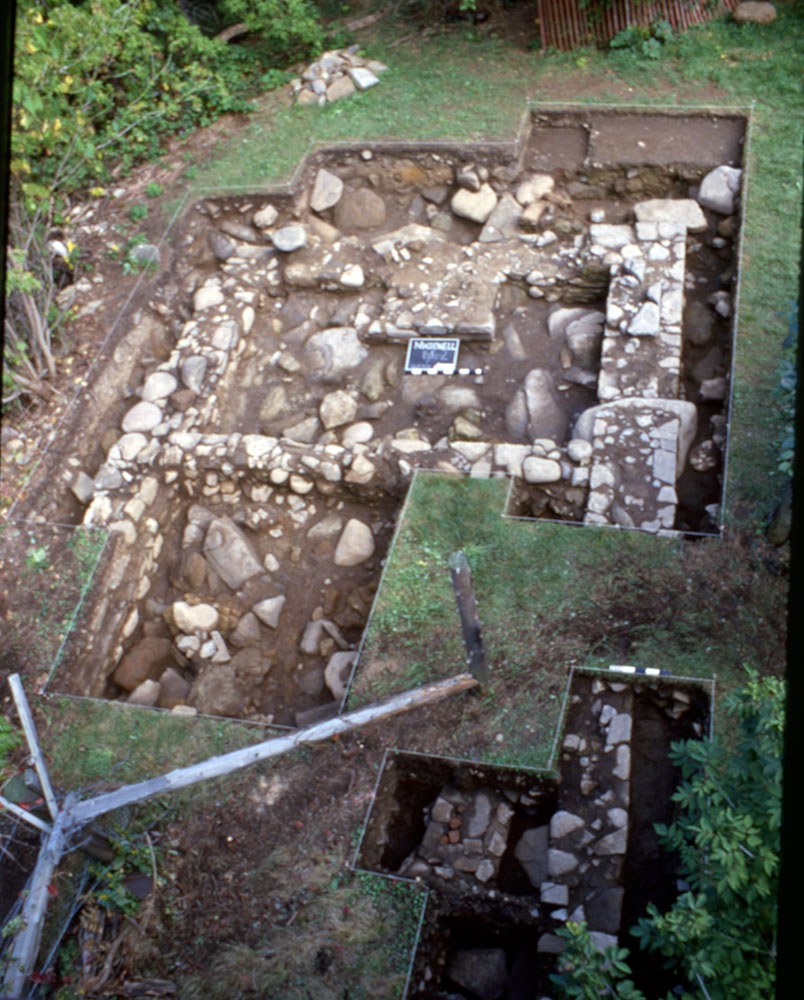 The work of several excavations has uncovered a wealth of physical records and new information, including structural evidence of earlier buildings. The foundations of the retail store built by Macdonell in 1822 were excavated to the north of the house. Excavation east of the basement entrance uncovered a massive stone foundation that runs diagonally to the main house wall. Based on the recovery of 18th-century coins associated with this feature, this structure may be one of the buildings that William Fortune constructed (and that appears on a 1797 map). Excavations of the southeast lawn area uncovered a late-19th-century driveway bedding surface and a dry-laid wall. This wall may be related to one of the Macdonell buildings appearing on the 1829 historical map of the property.