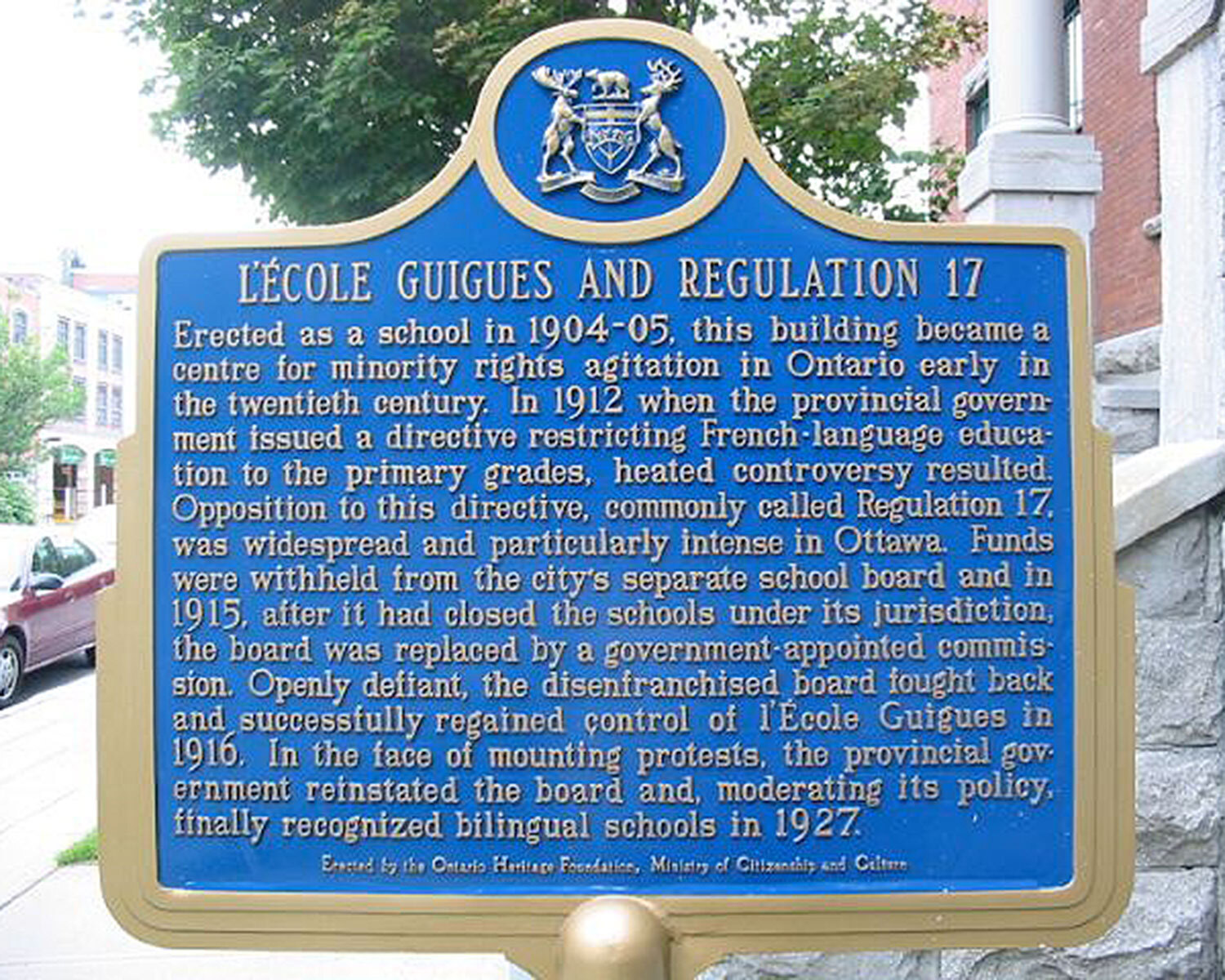 Provincial plaque commemorating l'école Guigues and Regulation 17